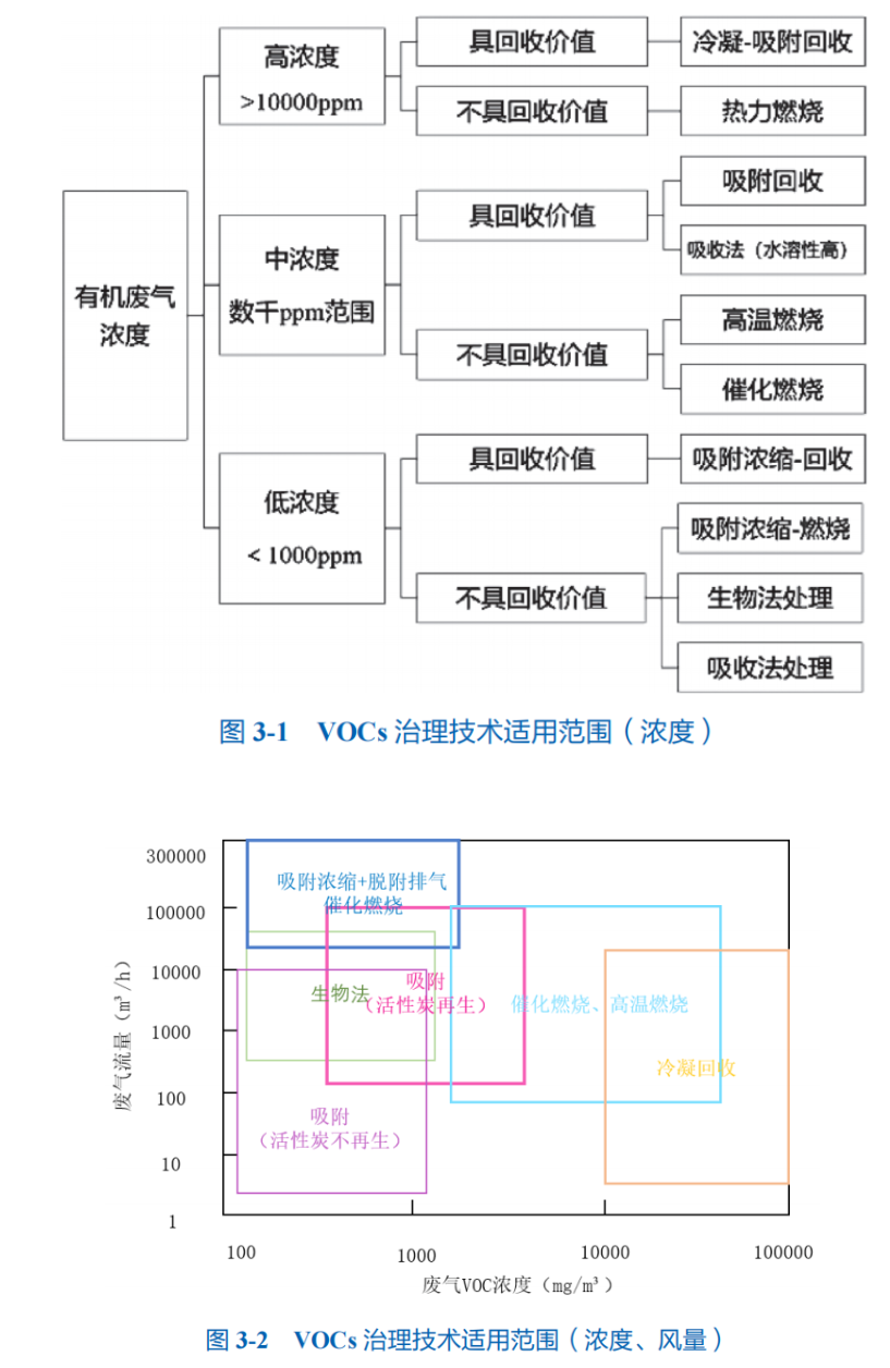 圖3-2直觀地給出了不同單元治理技術(shù)所適用的有機(jī)物濃度和廢氣流量的大致范圍。對于廢氣流量,圖中給出的是單套處理設(shè)備最大處理能力和比較經(jīng)濟(jì)的流量范圍。當(dāng)廢氣流量較大時,可以采用多套設(shè)備分開進(jìn)行處理。由圖可知,吸附濃縮+脫附排氣高溫焚燒/催化燃燒組合技術(shù)適用于大風(fēng)量低濃度VOCs廢氣的治理;生物法適用于中等風(fēng)量較低濃度VOCs廢氣的治理;吸附法(更換活性炭)適用于小風(fēng)量低濃度VOCs廢氣的治理;活性炭/活性炭纖維吸附溶劑回收適用于中大風(fēng)量中低濃度VOCs廢氣的治理;催化燃燒法、高溫燃燒治理技術(shù)適用于中小風(fēng)量中高濃度VOCs廢氣的治理;冷凝回收法適用于中低風(fēng)量高濃度VOCs廢氣的治理。高濃度的VOCs廢氣一般都不能只靠單一的技術(shù)來進(jìn)行治理,一般都是利用組合技術(shù)來進(jìn)行一個有效的治理,如采用冷凝回收+活性炭纖維吸附回收技術(shù)等。
