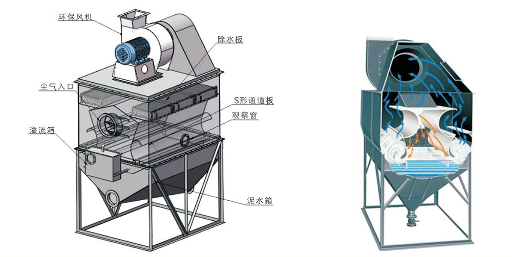 本設(shè)備主要由凈化箱、泥水箱、風(fēng)機(jī)底蓋、擋水板、“S” 形板、自動(dòng)補(bǔ)水箱、排污閥及風(fēng)機(jī)等部分組成。含塵氣體由進(jìn)風(fēng)口進(jìn)入凈化室,氣流轉(zhuǎn)彎向下沖擊于水面,部分較大的塵粒落入水中。當(dāng)含塵氣體以18~35m/s的速度通過上、下葉片間的“S"形通道時(shí),激起大量的水花形成一道水簾,使水、氣充分接觸,絕大部分微細(xì)粉融入水中,使含塵氣體得以充分凈化。凈化后的氣體經(jīng)檔水板去除水霧后經(jīng)風(fēng)機(jī)排出。灰塵所形成的污泥沉積在除塵器底部,定期清除。箱內(nèi)的水不斷循環(huán)使用,蒸發(fā)損耗的水由自動(dòng)補(bǔ)水箱內(nèi)的浮球閥進(jìn)行補(bǔ)充,保持水位的恒定。