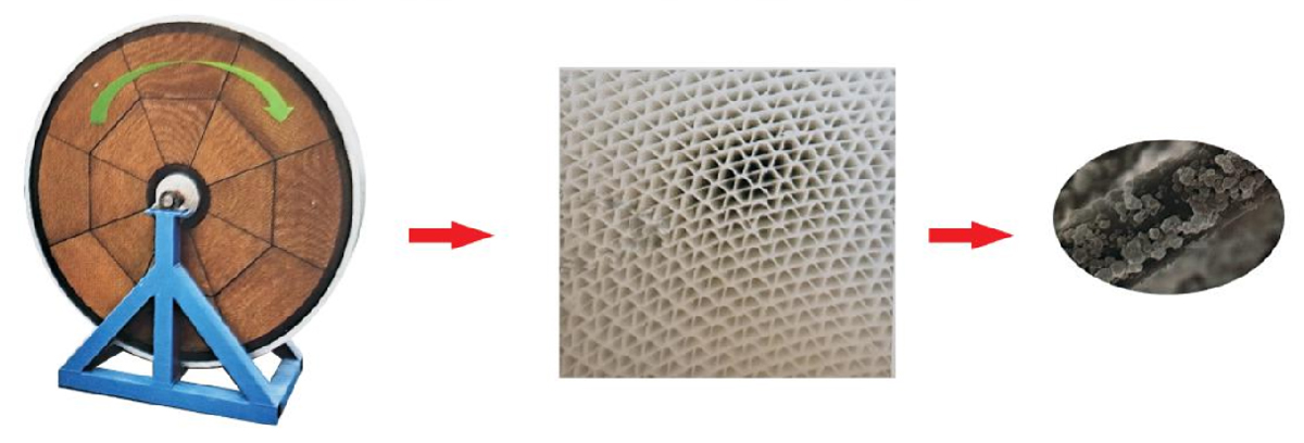 沸石轉輪吸附裝置是將高疏水性,耐高溫分子篩負載在蜂窩狀多孔纖維載體上制備而成的一種轉輪吸附濃縮設備。